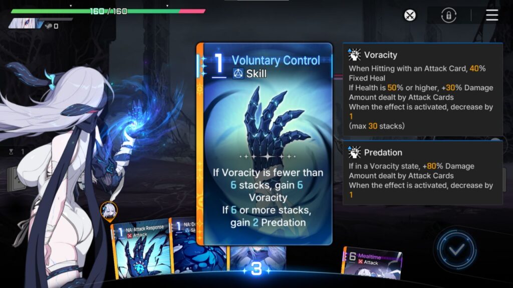 • Voracity (max 30 stacks): While active, every hit from Attack Cards heals the team for 40% and grants 30% bonus damage if team HP is above 50%. Each hit consumes one stack.