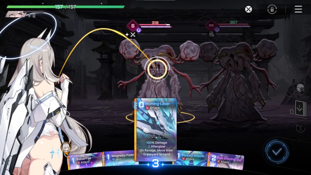 ![]() Homing Laser | 150% Damage. On Ravage, move to hand. Destroy: Add 1 Hit(s). | 150% Damage. 3 Afterglow. On Ravage, move to hand. | 150% Damage. 2 Afterglow. Create 2 Homing Laser L in Discard Pile. | 100% Damage. 1 Afterglow. On Ravage or at the start of the turn, move to hand. | 150% Damage. 2 Afterglow. Move all Homing Laser L in Graveyard to hand. |