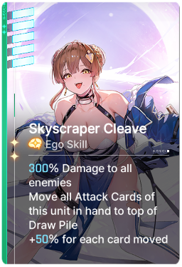 | Ego Skill | Deal 100% Damage to all enemies. Draw 1 Attack card(s) from the assigned combatant with cost of less than or equal to 1. |